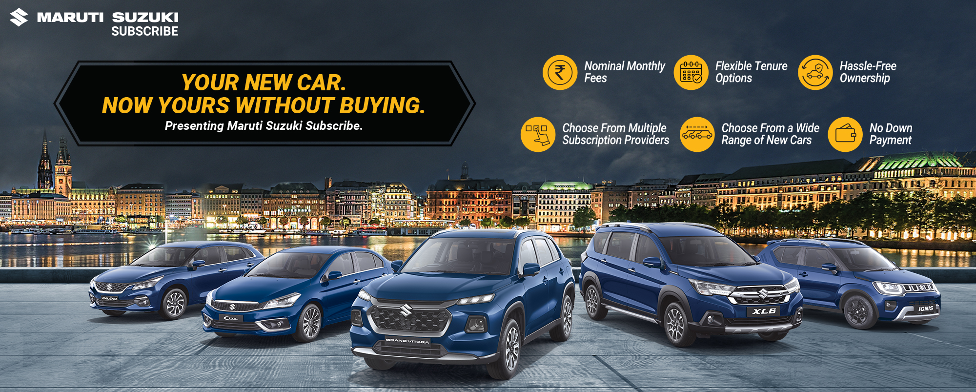 Maruti Suzuki Subscribe enables all customers to enjoy driving their preferred Maruti Suzuki cars without having to deal with all the financial responsibilities that come with owning a car.All you need to do is opt for a monthly subscription plan at a fixed monthly fee, which includes the routine maintenance and insurance costs, and choose a flexible tenure. At Mahamaya Autocars in, , Ambikapur, all Hatchback, Sedan, SUV, the MUV models line-up includes Baleno, Invicto, EVitara, Jimny, Ciaz, Ignis, Fronx, Grand Vitara, XL6. Here, you will enjoy Maruti Suzuki Subscribe benefits such as: